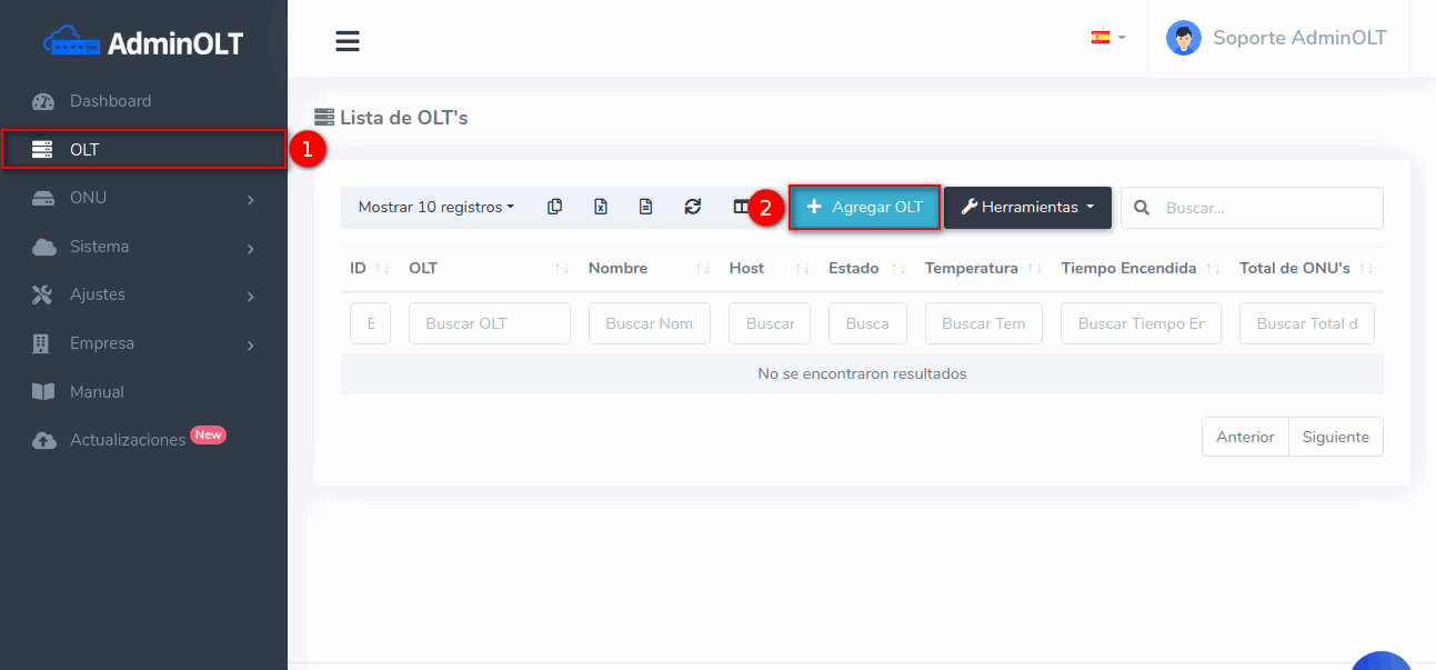 1 Inicie sesión en su cuenta de AdminOLT por medio del dominio que se le brindó en un principio y acceda al apartado OLT, y seleccione la opción Agregar OLT