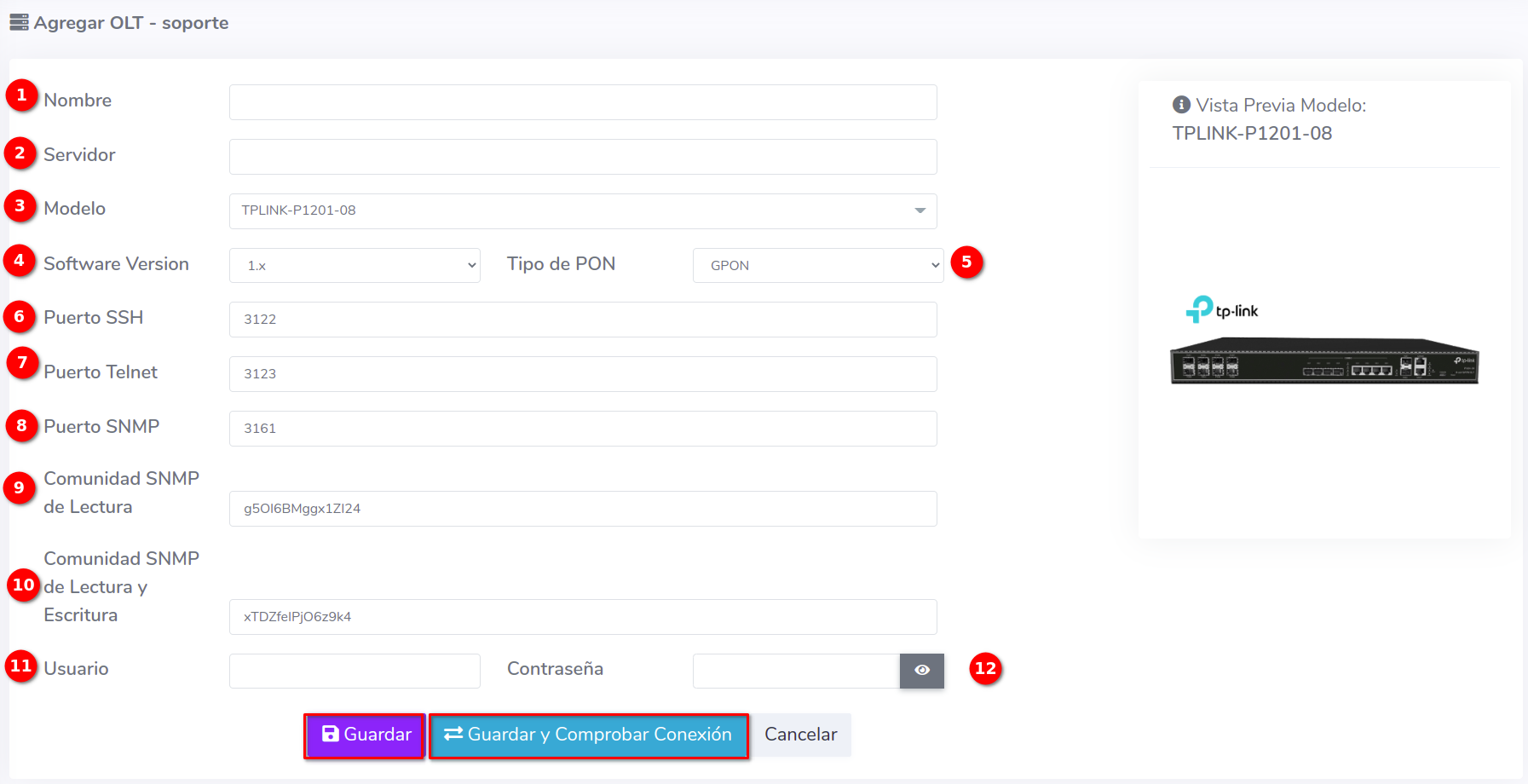 - Nombre: Se refiere a como nombrara a su OLT en el sistema AdminOLT. Este es definido por usted y no afectará a la conexión.