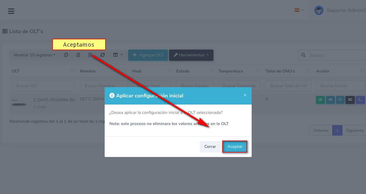 Al aplicar esta acción AdminOLT creará las comunidades que registró al momento de agregar la OLT en el sistema, de igual manera se creará un LineProfile que se usará al momento de autorizar una ONT esto implica la creación de una DBA y por último se crearán unos Traffic Tables.