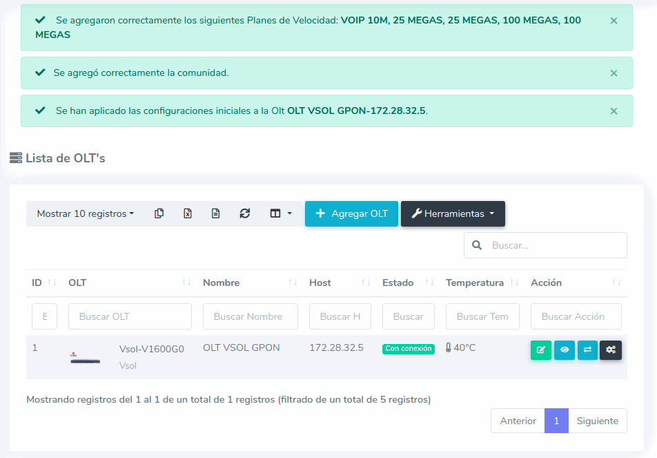 Después de aplicar las configuraciones iniciales, puede demorar entre 10-20 minutos en verse reflejados en su OLT.