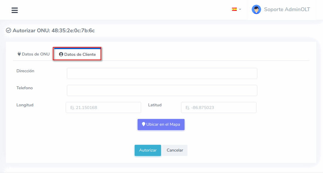 1 Para ver los dispositivos que aún no han sido autorizados, debemos dirigirnos a la sección ONU > Sin Autorizar y seleccionar alguna ONU disponible.