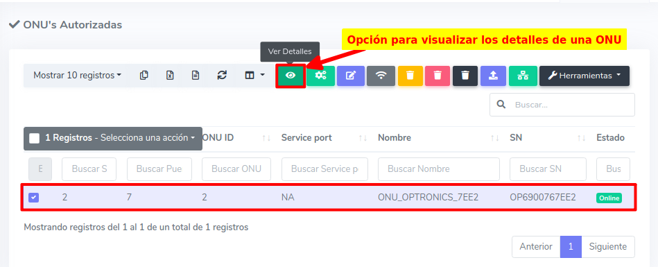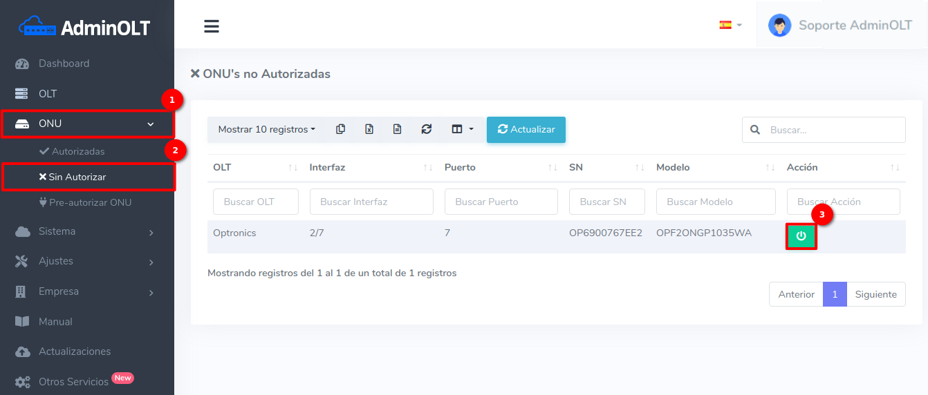 1Para ver los dispositivos que aún no han sido autorizados, debemos dirigirnos a la sección ONU > Sin Autorizar y seleccionar alguna ONU disponible.