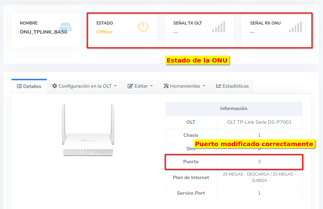 En este momento si vemos el estado de la ONU, este se encuentra en Offline debido a que físicamente no sé ha cambiado la ONU de Puerto, pero en AdminOLT si se ha actualizado la información.