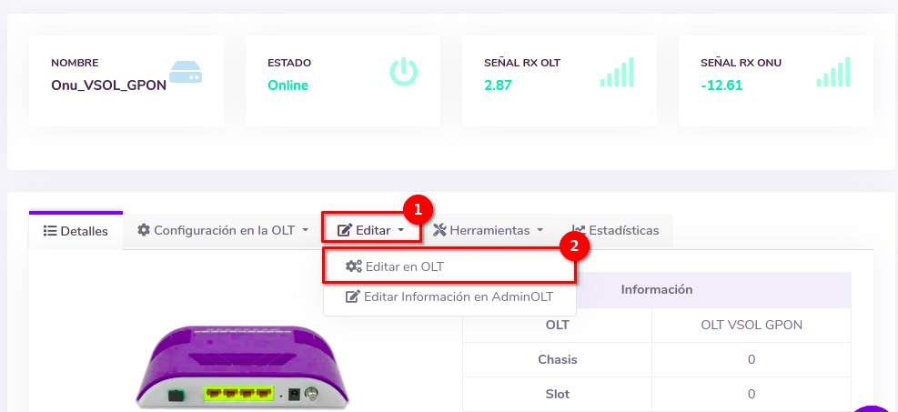 Dar click en el texto Editar en OLT que se encuentra en el botón con la leyenda Editar.