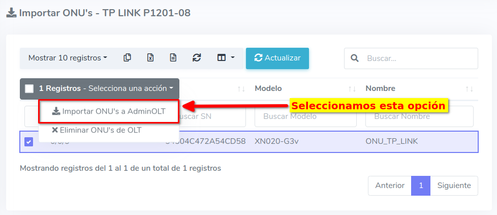 3Una vez que hayamos seleccionado los equipos, importamos las ONU's al sistema AdminOLT
