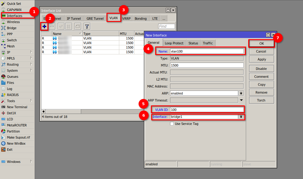 1 Nos dirigimos al apartado de Bridge en el menú de nuestro RouterBoard para generar la interfaz bridge1 y así poder agrupar los puertos que estarán trabajando en la red de la OLT.