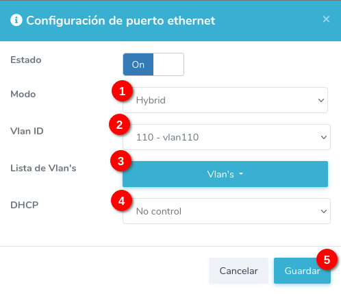 Coloque la opción modo en Hybrid, coloque una vlan en la opcion Vlan ID, seleccione las vlan's en la opcion Lista de Vlan's, seleccione el tipo de DHCP y guarde el cambio