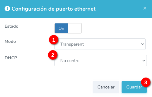 Coloque la opción modo en Transparent, seleccione el tipo de DHCP y guarde el cambio