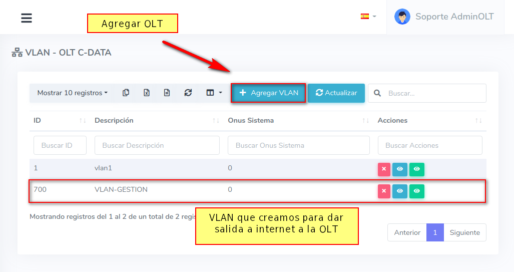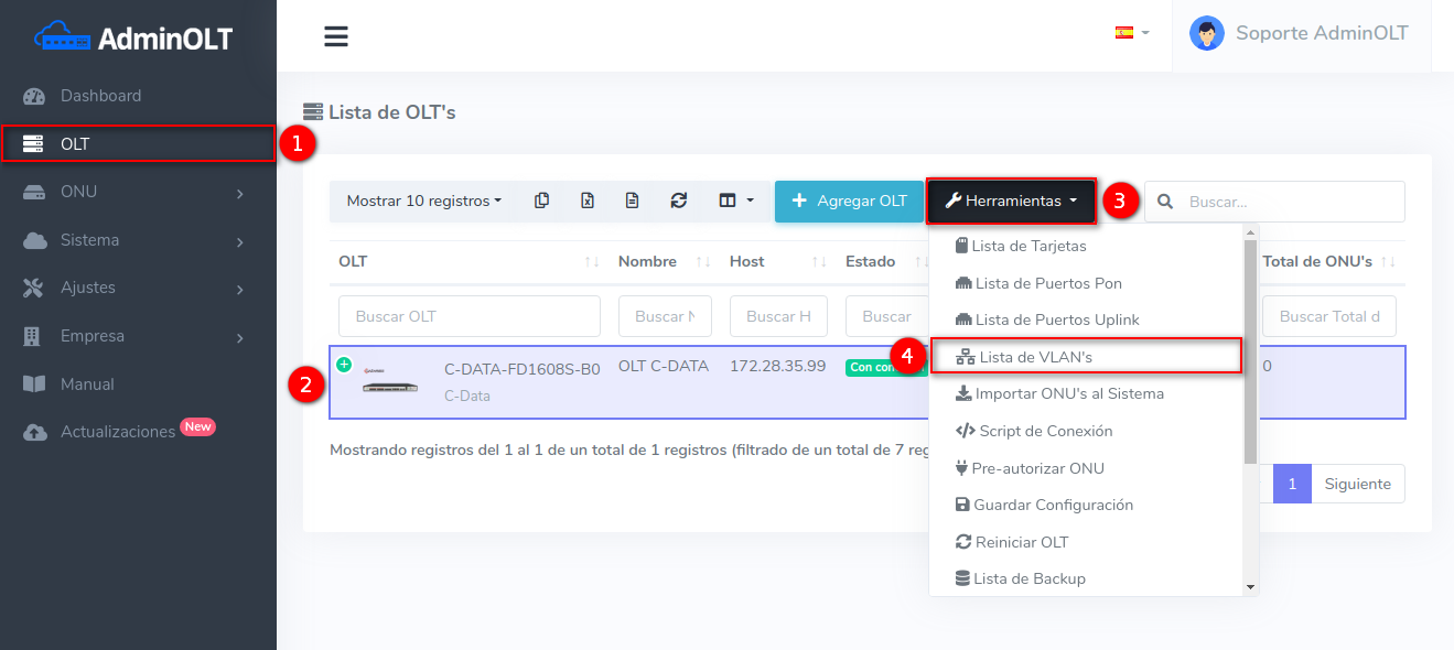 2 Después de agregar esta vlan en tu router, podremos agregarla en la OLT desde la Lista de OLT's seleccionando la OLT y la opción Lista de VLAN's.