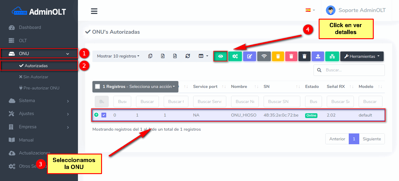 Pasos para editar información de ONU Autorizada en AdminOLT