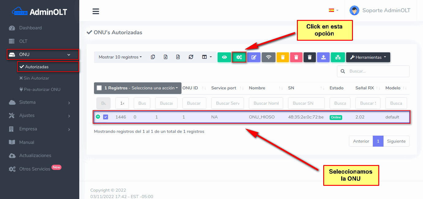 Tome en cuenta que es necesario contar con ONUs No Autorizadas en la misma OLT que la ONU Autorizada para utilizar esta función. En este ejemplo usaremos el SN de las ONUs Hioso