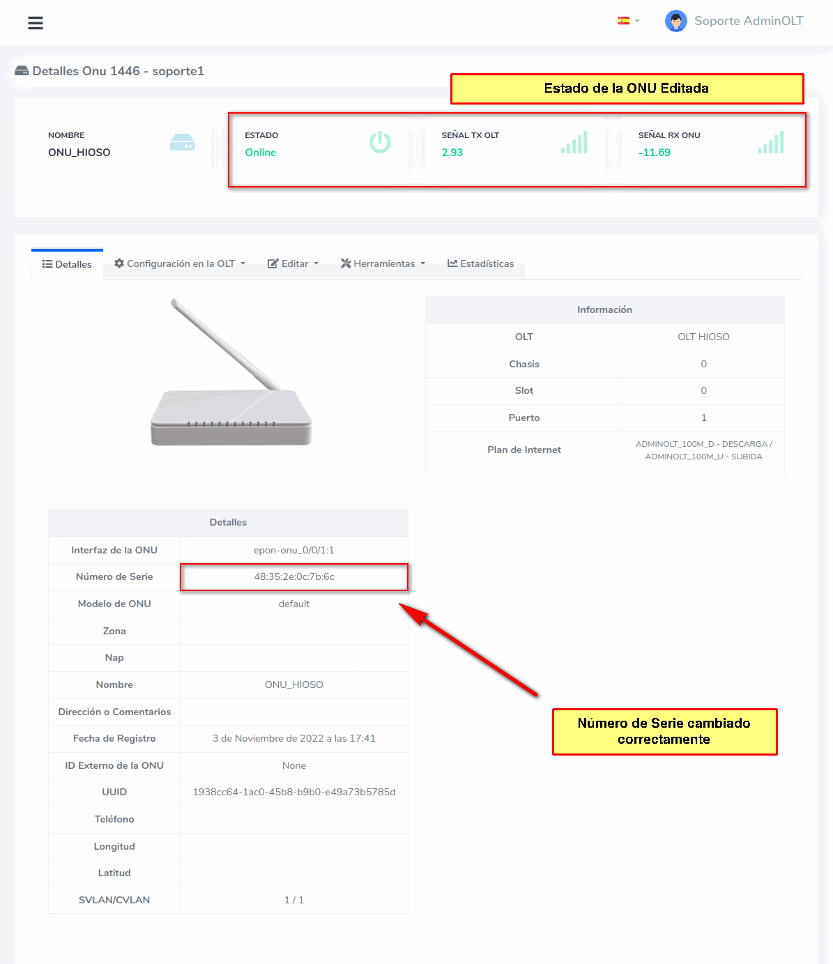 En AdminOLT podemos editar información de una ONU Autorizada en la OLT, supongamos que alguna de las ONUs que tenemos autorizadas en el sistema se estropea. Tomaremos como ejemplo esta situación para explicar el propósito de esta función. Así que en ese caso en AdminOLT al editar ONU por SN podemos tomar información de alguna ONU no Autorizada y usarla, sin perder la configuración inicial que teníamos.