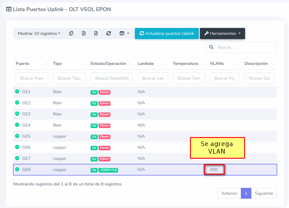1En la Lista OLT's seleccionamos el equipo con el que trabajaremos para después ir a Puertos Uplink, que se encuentra en el botón con la leyenda Herramientas.