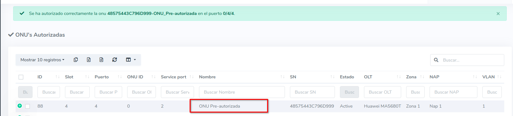 4Una vez completó el formulario, de click en "Autorizar". Sera redirigido a la lista de ONU's donde podrá visualizar los datos de la ONU que ingresó en el formulario.