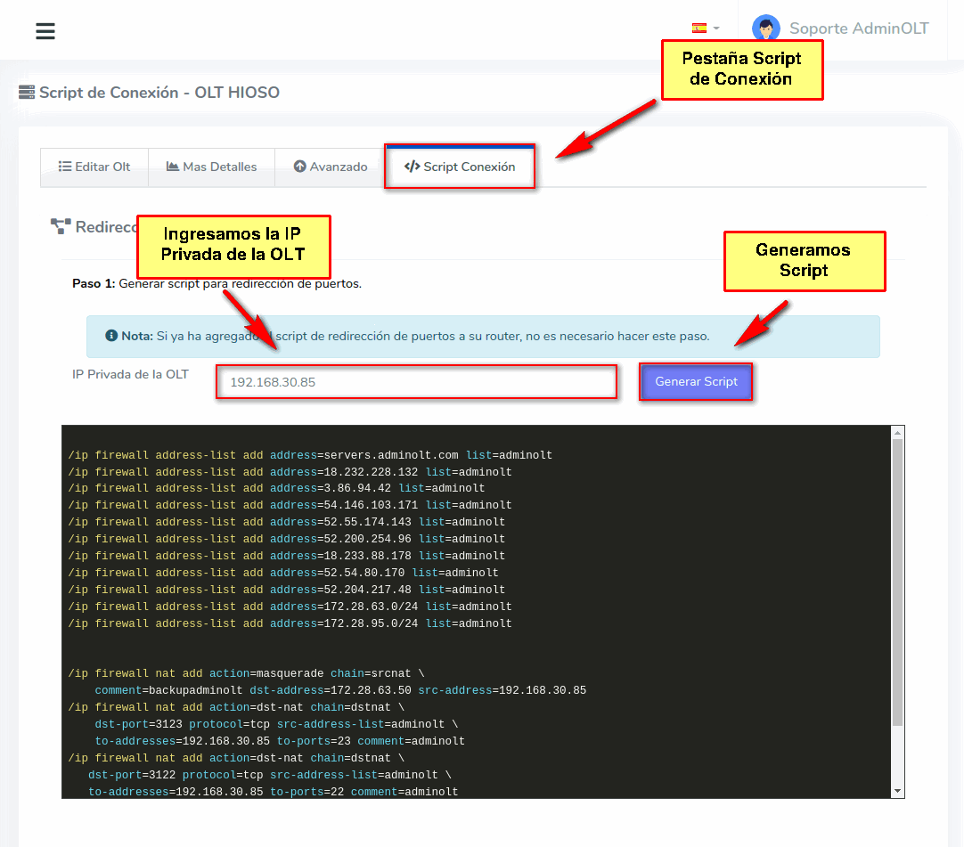 2 Nos dirigimos en la pestaña Script Conexión, aquí ingresaremos nuestra ip privada y seleccionamos la opción Generar Script. A continuación veremos que se nos proporciona un Script.