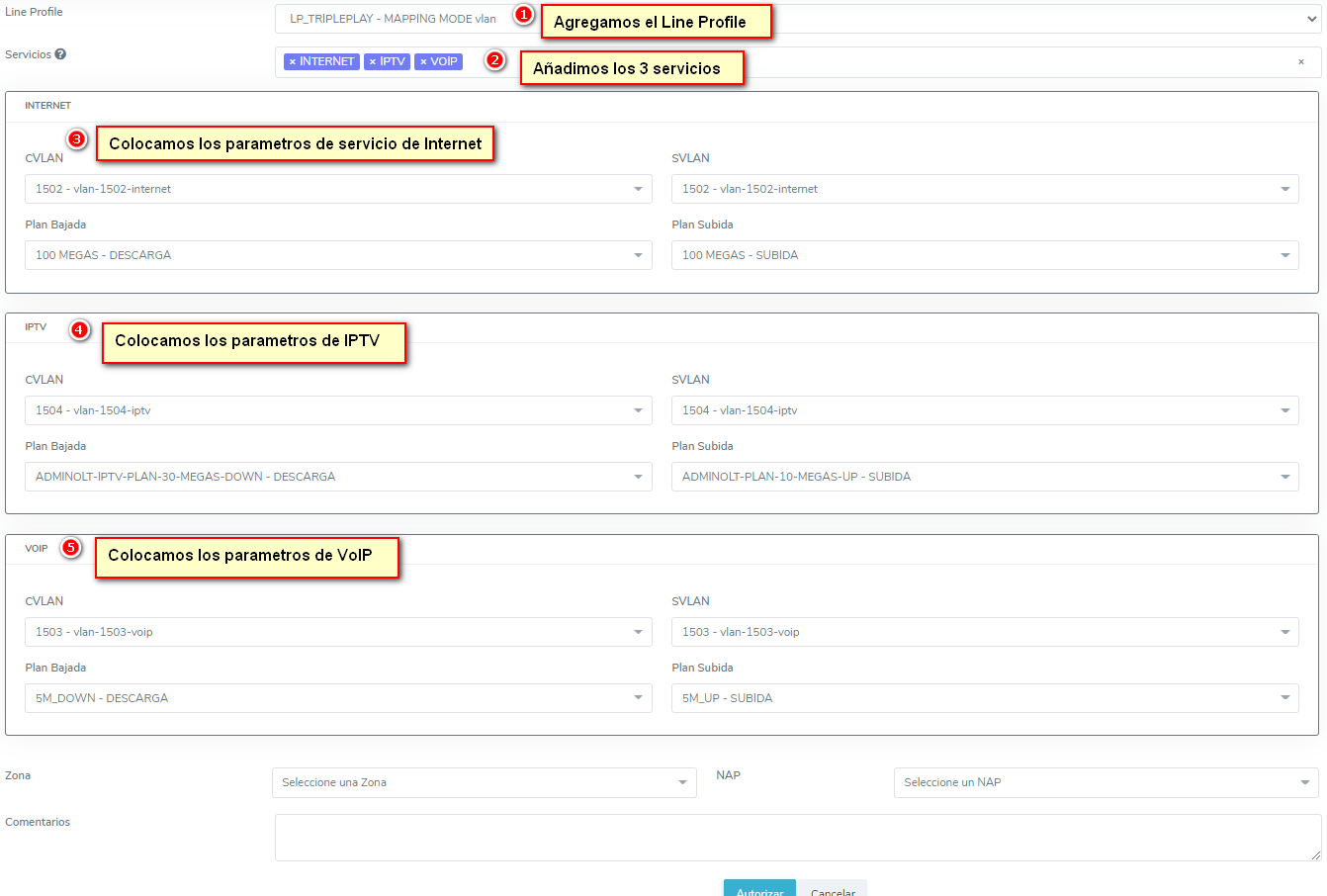 - Triple Play con Line Profile mapeado por VLAN