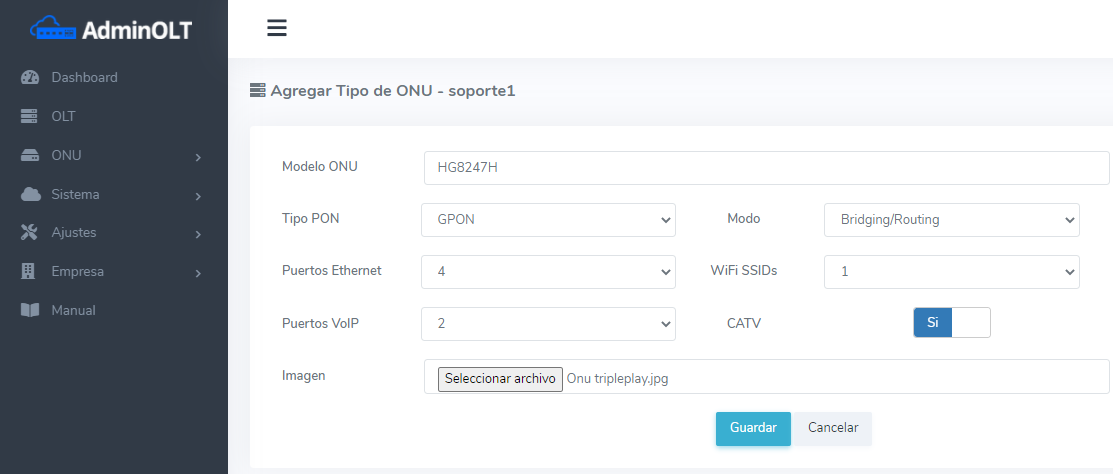 Vamos a Sistema/Modelos de Onu y añadimos el modelo con las especificaciones que seleccionemos